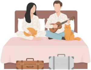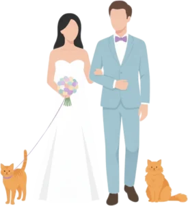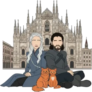 Sette anni dopo, l’aria notturna si tinse di un bagliore scarlatto. Le corde vibrarono nell’aria con un suono che solo loro due riconoscevano. Le ombre dei loro guardiani pelosi ad osservare. La promessa fu sussurrata al suo “anello da principessa”. Non ci furono prove, né riflettori. Solo loro, i gattini e delle valigie… solo loro, a piangere di gioia, per dirsi sì per tutta la vita.